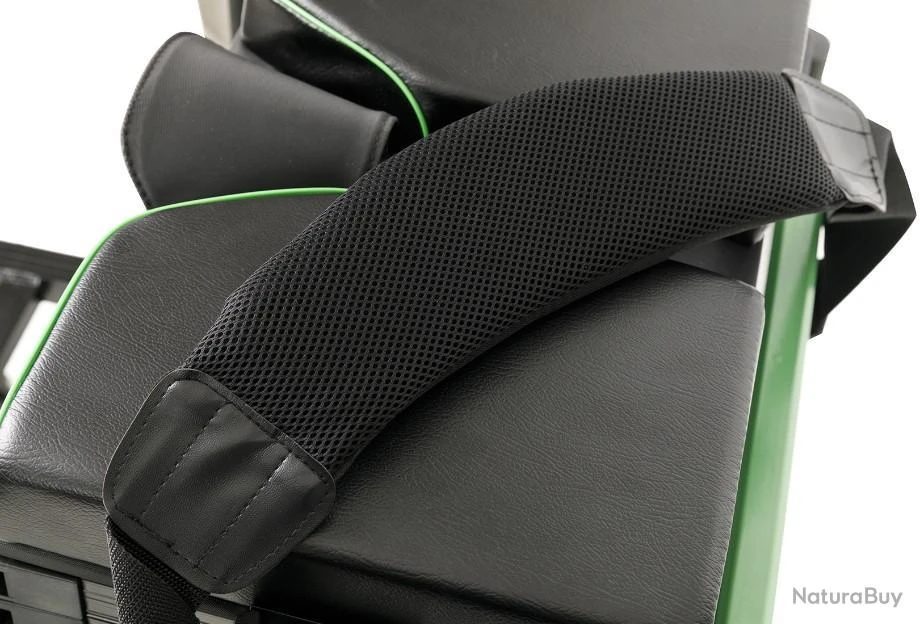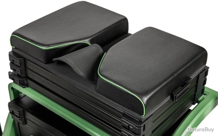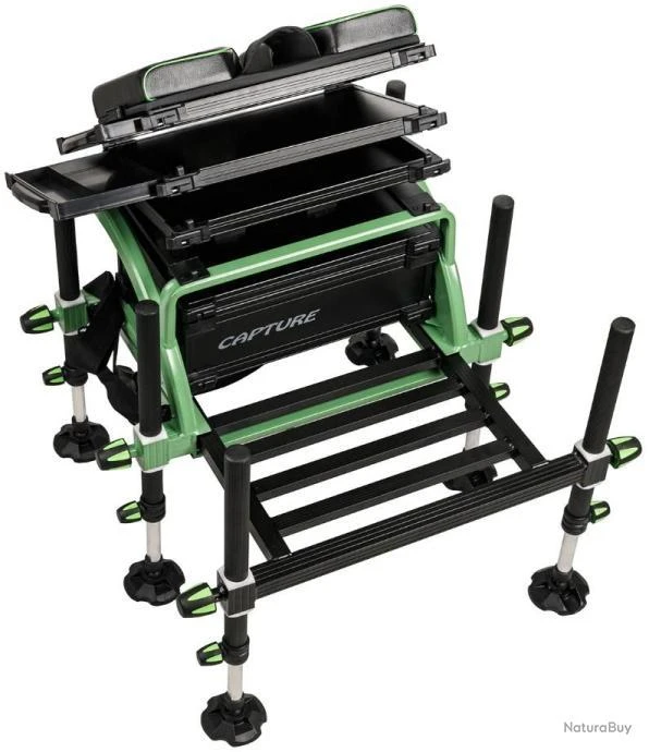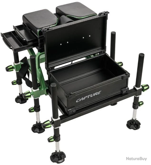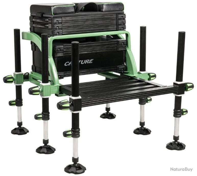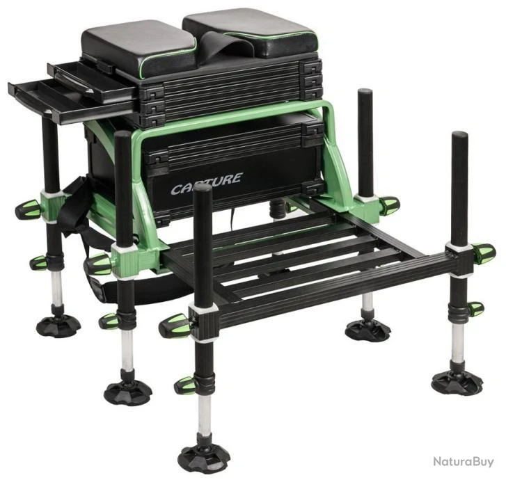 Capture Outdoor, station de pêche « Prestige XP-6 Competition ». La station est composée de 6 pieds télescopiques de diamètre 36. Les pieds à rotule sont extra-larges. L’assisse est dotée d’un bloque-talon. La station propose une plateforme repose-pied de 48,7 x 35,2 cm. Le bloc supérieur sous l’assisse est composé de 2 tiroirs latéraux compartimentés en 4 (43 x 25,5 x 2,2cm chacun) et d’un troisième compartiment (43 x 25,5 x 2,7cm). La station offre également un caisson de rangement amovible avec poignet de transport (43,5 x 27 x 15cm de profondeur). Cadre en aluminium. Système de serrage anti-rayure. Assisse et sangle-épaule rembourrée. La station totalement repliée mesure 48cm de hauteur, 71,5cm au plus large et 47cm de profondeur. Son poids est de 17,32kg.
