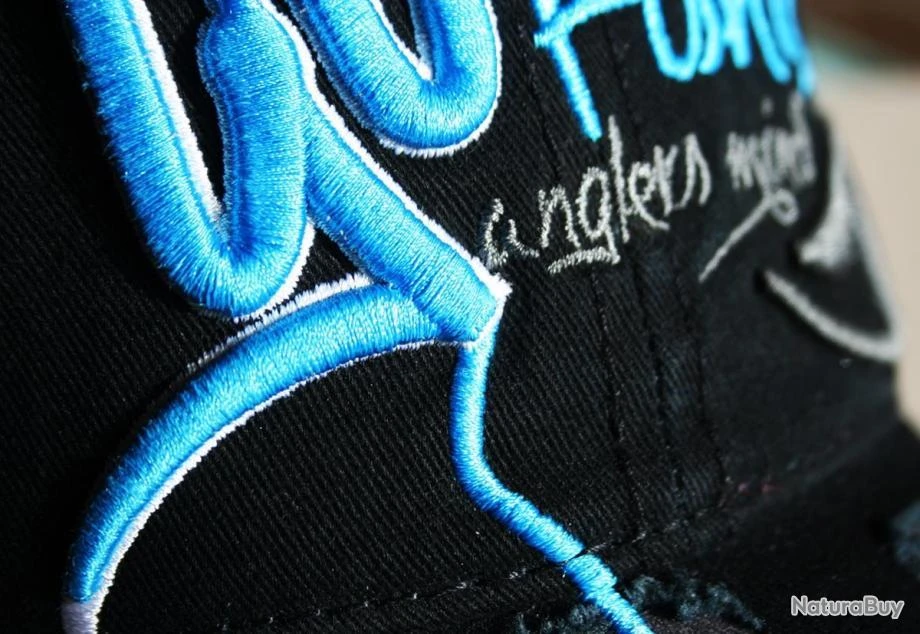 Capuchon devant: sur le côté droit, le texte «GO» brodé en 3D avec du fil bleu clair. A partir du texte GO commence une ligne de pêche brodée de couleur bleu clair 3d qui arrive sur la visière et qui se termine par un crochet stylisé. Sur le côté gauche, le texte «Fishing» brodé en bleu clair et le texte «Angler’s mind» brodé en anthracite, le logo stylisé HOTSPOT eye brodé en fil de couleur anthracite 3D. Visière: visière avec des coupes irrégulières avec tissu de fond de couleur camouflage nuit camouflage et bordures vieillies sur les coupes. Ligne de pêche et crochet stylisé en broderie 3D couleur bleu clair arrivant au centre de la visière. Côté gauche: patch avec logo brodé Hotspot Design.