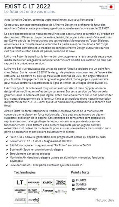 Caractéristiques du moulinet Daiwa spinning Exist G LT 2022 5000 DC XH