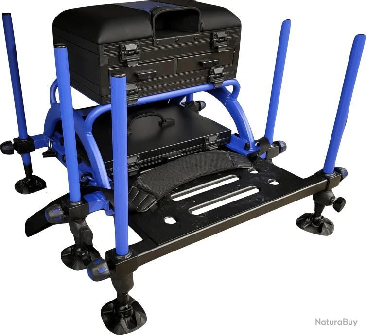 Station composée de 6 pieds de diamètre 25 de couleur bleue dont 4 télescopiques. Elle est équipée de deux casiers et de deux tiroirs frontaux, d’un repose pieds et d’un bloque talon sur l’assise ainsi que d’une mallette amovible.